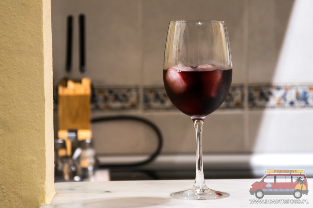 - Wlewamy około 100 mililitrów (1 część) mocno schłodzonego czerwonego wytrawnego wina.W Hiszpanii używa się do tego typu drinków raczej taniego wina, często sprzedawanego w kartonowych lub plastikowych butelkach (w cenie 1-1,5 euro za litr).