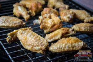 Po około 18-20 minutach nasze skrzydełka powinny być już chrupiące i dobrze usmażone. Najlepiej wyciągnąć je na chwilę na kratkę grillową (np. taką z piekarnika), na której wyschną z oleju. Jest to bardzo ważne, bo pozwoli zachować ich niesamowitą chrupkość. Jeśli nie macie kratki, możecie odsączyć je z nadmiaru oleju za pomocą ręcznika papierowego. Ważne, aby nie pozostawiać ich na ręczniku zbyt długo, ponieważ mogą zaparować i stracić przez to swoją chrupkość. Skrzydełka wrzucamy do miski z sosem i ruchem podobnym do tego, którego używamy do mieszania rzeczy na patelni czy woku, obtaczamy je w sosie.