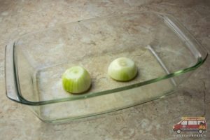W naczyniu żaroodpornym układamy przekrojoną na pół cebulę, na której będzie leżeć mięso.