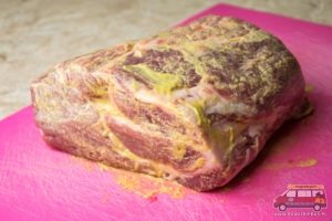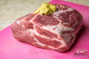 Karkówkę osuszamy ręcznikiem papierowym i kładziemy na deskę. Dodajemy dwie łyżeczki musztardy.Zamiast tego można do mieszanki przypraw dorzucić 1/2 łyżki musztardy w proszku (Dry mustard Colman's jest bardzo popularna w USA, niestety w Polsce słabo dostępna).