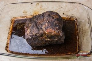 Mięso wkładamy do piekarnika rozgrzanego na 140 stopni i pieczemy bez przykrycia 60 minut.Piekarnik ustawiony na grzanie góra-dół bez termoobiegu. Po godzinie nasze mięso powinno już dość ładnie wyglądać. Teraz pora na jego powolne przygotowanie.Zmniejszamy temperaturę do 100 stopni i pieczemy pod przykryciem przez około 5 godzin. Jeśli wasz kawałek będzie większy, powinniście wydłużyć pieczenie, około 1,5-2 dodatkowe godziny na każdy kilogram mięsa. Mięso możemy wcześniej sprawdzić, jeśli łatwo będzie się rozrywać przy użyciu widelca jest już gotowe. Jeśli jest jeszcze twarde to potrzebuje jeszcze trochę czasu w piekarniku.